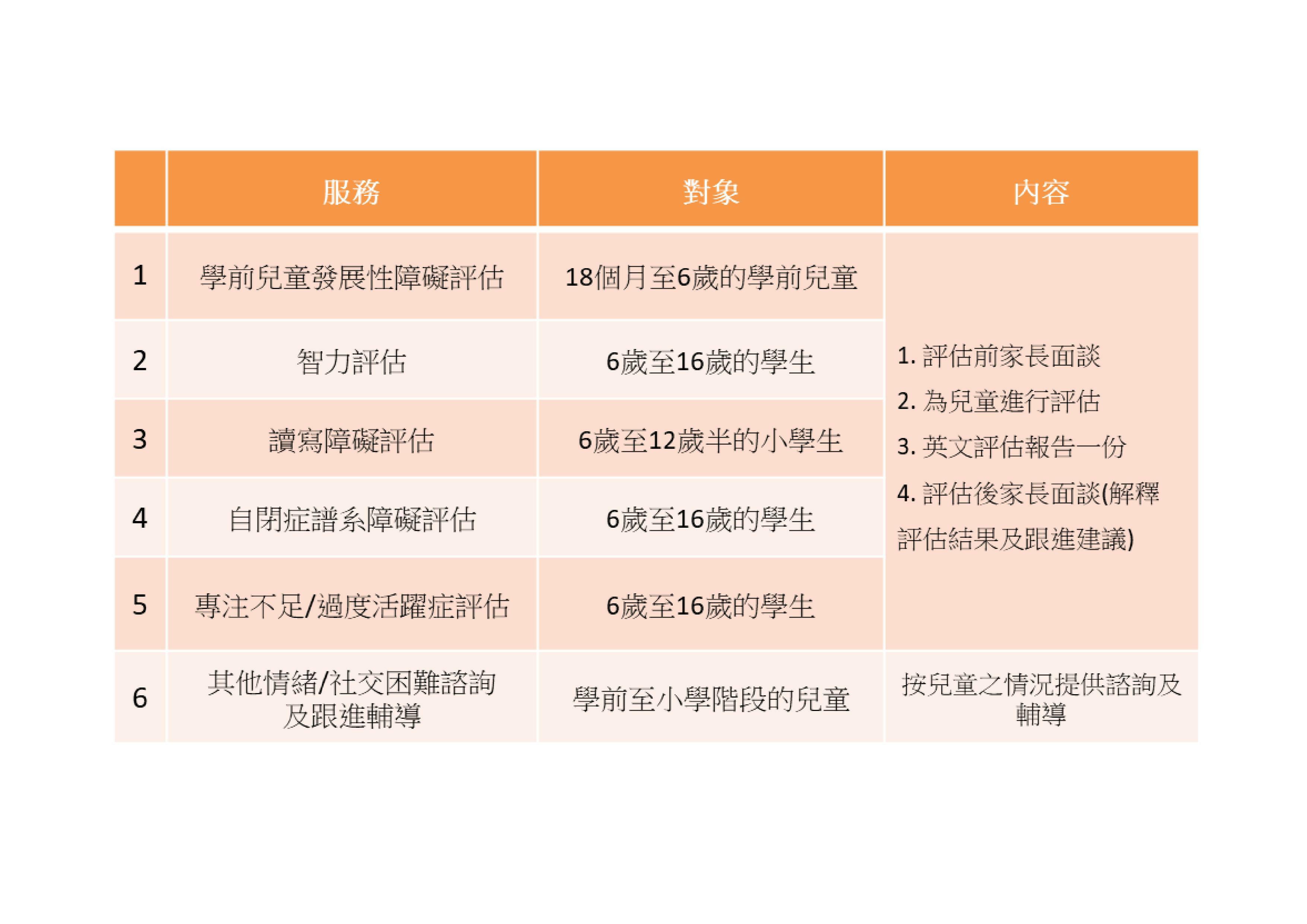 教育心理學家為懷疑有發展差異或特殊教育需要的兒童,提供評估、輔導建議及/或服務轉介。旨在提升兒童於學習、情緒、社交及行為等各方面的發展,協助家長了解子女的能力和需要,在照顧及管教上作出配合。