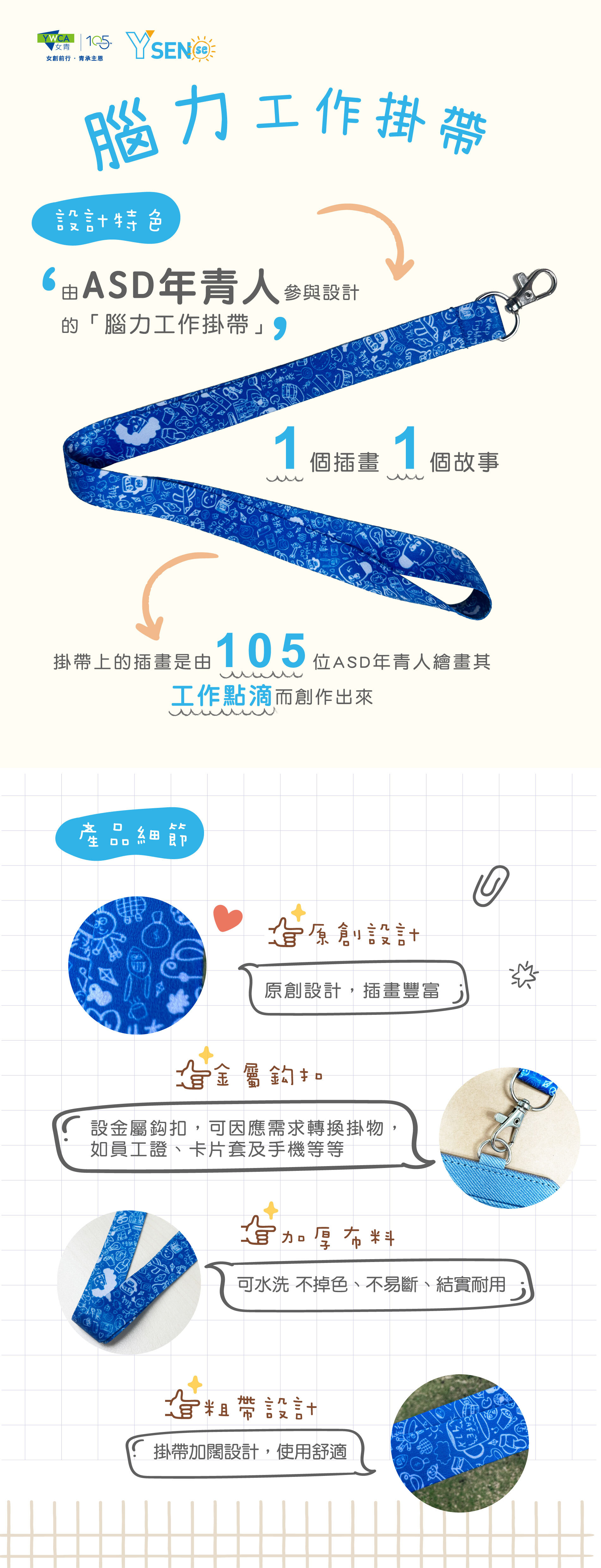 由自閉症譜系障礙(下稱ASD)年青人參與設計,掛帶上的插畫取材自105位ASD年青人的工作點滴,可作為職員證、卡套及手機等的掛帶